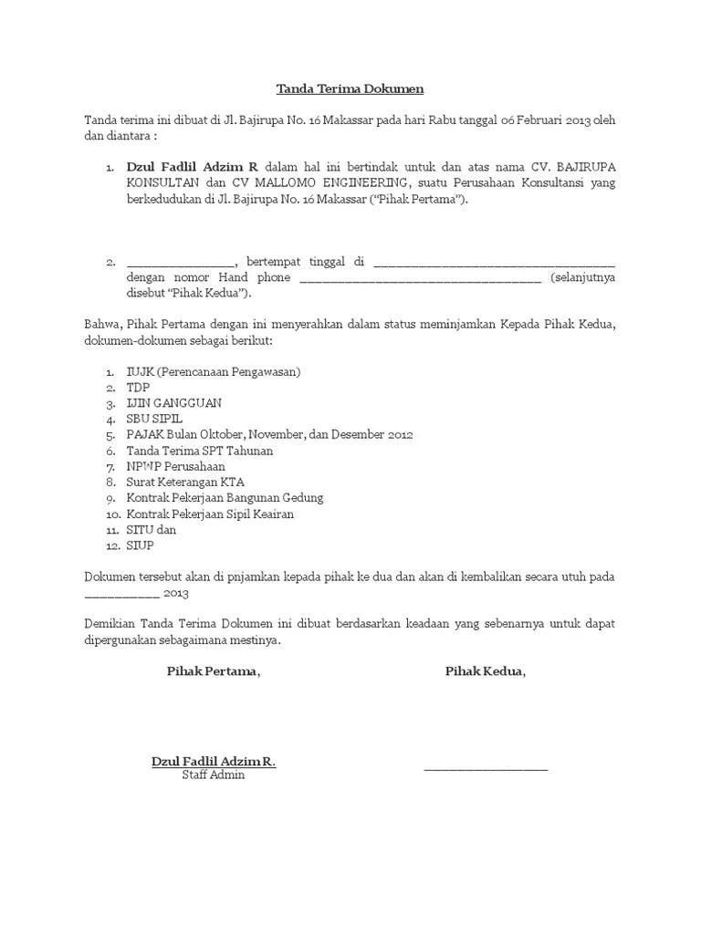 Surat ini dibuat sebagai bentuk tanda terima akan penerimaan dokumen telah sampai di tangan yang tepat. Contoh surat tanda terima dokumen. Namun biasanya tanda terima dipergunakan ketika pengiriman barang atau dokumen sebagai bukti bahwa barang yang telah. Contoh tanda terima barang dokumen uang surat dan pembayaran. Mau tahu cara mengurus surat roya? Dokumen dari kelurahan atau desa, seperti surat keterangan tidak sengketa, surat keterangan riwayat tanah, dan surat keterangan tanah secara sporadik. Disetiap perjanjian atau kegiatan pastinya akan ada sebuah atau beberapa dokumen penting dan akan diadakan serah terima. Ketika anda menggunakan jasa pengiriman dokumen melalui jasa ekspedisi, maka biasanya anda akan mendapatkan surat sebagai bentuk tanda terima. Di dalam pembuatan surat ini, ada beberapa hal yang tidak boleh anda lewatkan, selain memperhatikan mengenai bahasa yang akan anda gunakan di dalam surat tersebut. Tanda terima dokumen tanda terima ini dibuat di jl. Surat tanda terima dokumen digunakan sebagai tanda bukti bahwa dokumen telah dikirimkan. Berita acara pembagian raport dan daftar serah terima katulis. Serahkanlah untuk melengkapi dokumen yang telah ada.